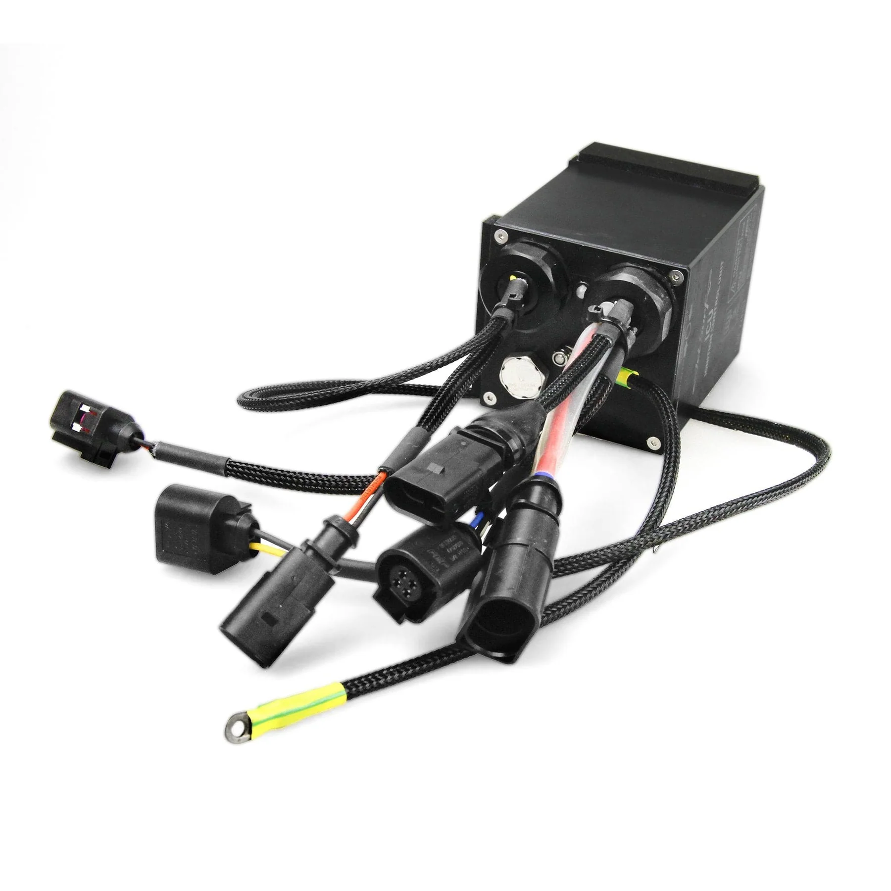 It uses multiple connectors: one to the water pump, one to ignition system, ground, and others. Replacement procedure requires disconnecting about 6 connectors in total.
